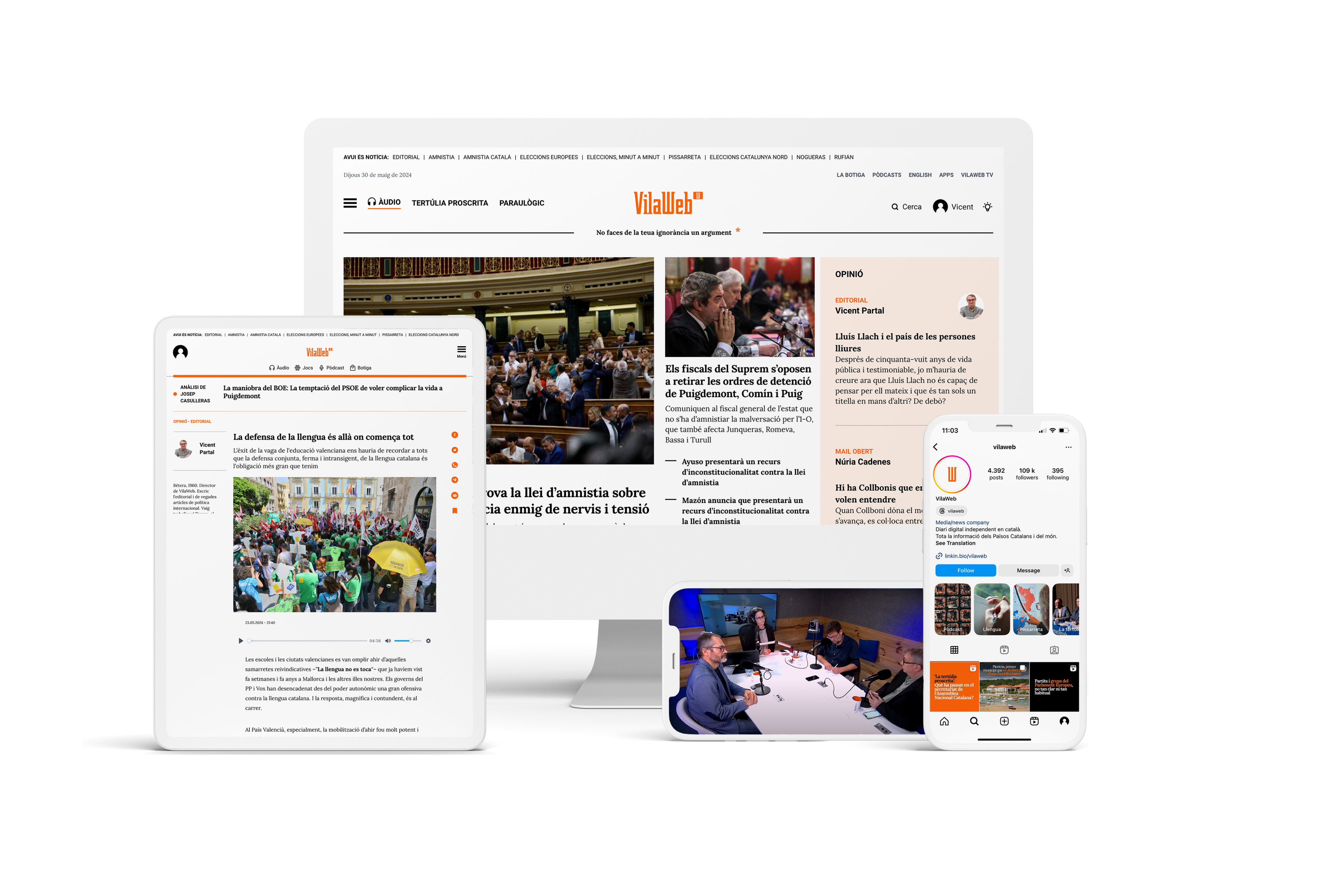 VilaWeb no solament ha estat el diari pioner d’internet, sinó que ha anat evolucionat juntament amb la xarxa. I fa anys que demostrem el nostre compromís amb el periodisme i amb la societat, amb el país. Un diari valent, rigorós i compromès.